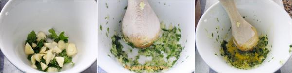 3. Vierte un chorro de aceite al mortero y remueve todo. Reservar.