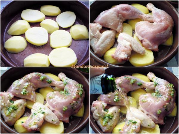 5. Limpia el pollo y pon los trozos sobre las papas. Añade el majado del mortero encima del pollo.