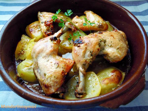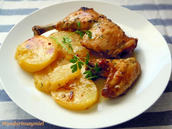 7. Cocina en el horno a 180ºC unos 60 minutos o hasta que veas que el pollo está dorado y las papas tiernas.