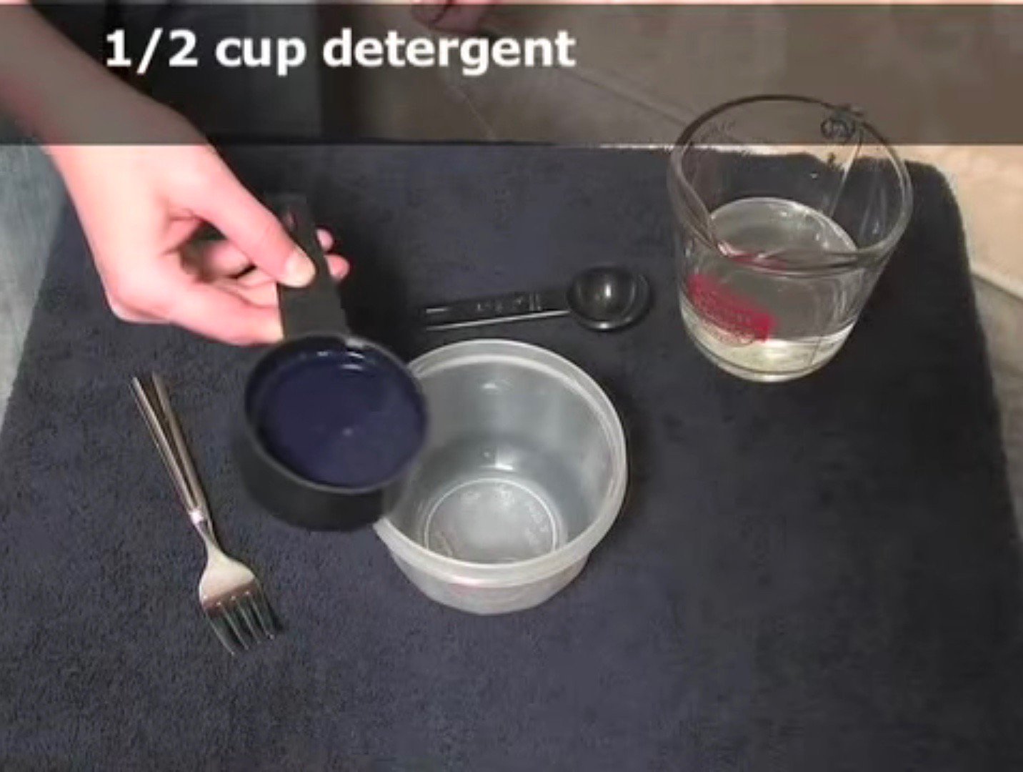 4. Media taza de detergente para lavadoras y dos cucharaditas de agua.