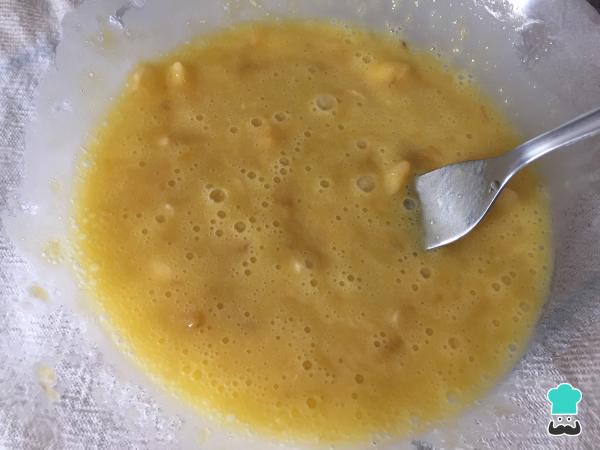 Añade el huevo batido al bol con los plátanos y mezcla usando un tenedor o varillas, pero no tritures en exceso la fruta.