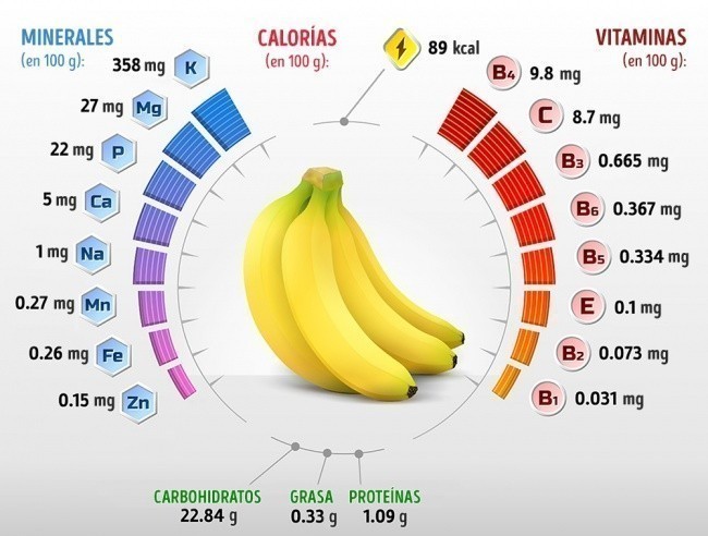 Los plátanos son ricos en vitamina B6, en promedio, un plátano contiene el 20% de la dosis diaria de esta vitamina. Le ayuda al organismo a producir la insulina, la hemoglobina y los aminoácidos necesarios para crear células saludable. A pesar de que cuando escuchamos hablar de vitamina C, en lo primero que pensamos es en naranjas y fresas, una porción de plátanos también contiene un 15% de nuestra dosis diaria de esta vitamina.