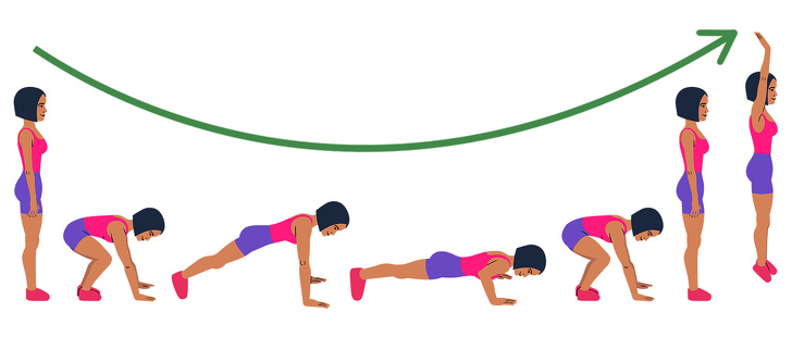 2. Saltar hacia atrás para quedar en la posición de plancha manteniendo los brazos extendidos.