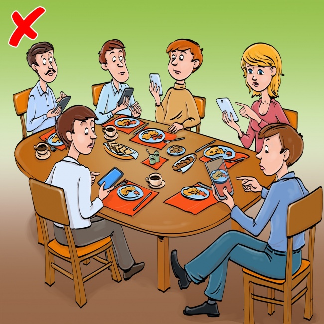 Aparte, de no ser higiénico, tener el celular en la mesa es una señal de malos modales. Lo mejor es poner el teléfono en el modo de vibración y guardarlo en el bolsillo. Se tiene que destacar que para una persona bien educada todos los interlocutores virtuales son secundarios. Si en medio de la cena de repente llama alguien a quien tienes que responder sí o sí, hay que disculparse, abandonar la mesa y resolver todos los problemas realmente urgentes lo más rápido posible fuera de la mesa.