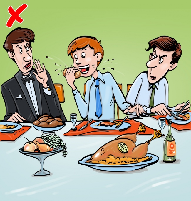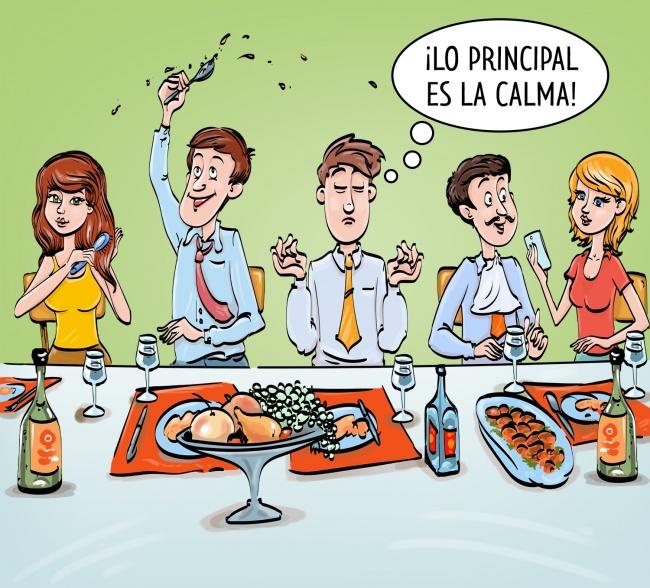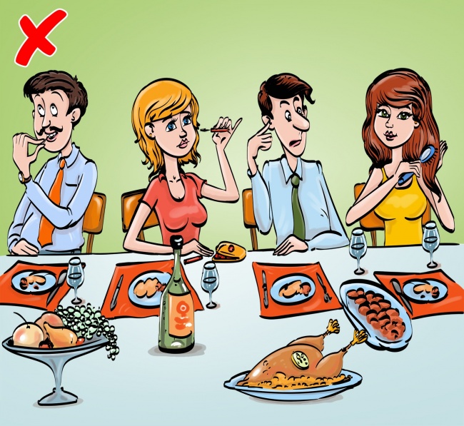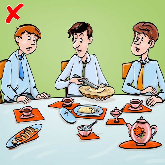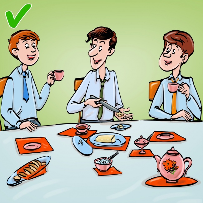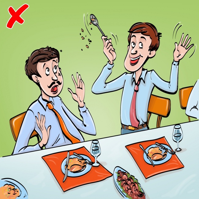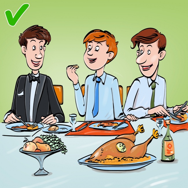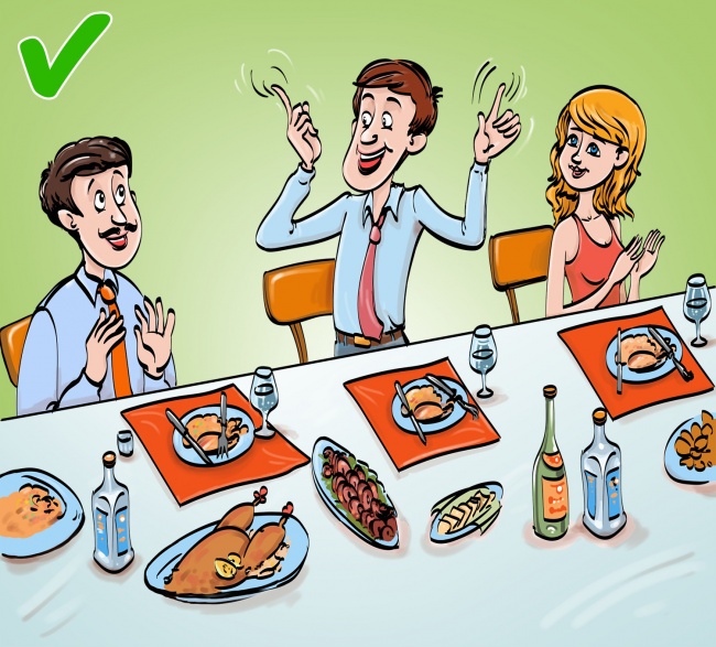 Es de muy mala educación estar enseñando de etiqueta durante la cena, porque un conocedor de la etiqueta nunca debe contarles a todos sobre las reglas y burlarse de la gente. Incluso si tu acompañante pone sobre la mesa su celular, come haciendo ruido con la boca abierta y mete un tenedor enfrente tuyo debes soportarlo. Sé paciente y ahora te recomendamos respirar y meditar.