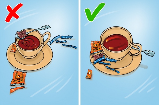 La mejor manera es sacar el saquito con una cuchara (sin tocar el hilo con la manos), apretar ligeramente con el borde de la taza y colocarla en la parte superior izquierda del platillo. Allí también dejamos el envoltorio de té y el sobrecito de azúcar. Básicamente, nada debe quedar en el mantel ni en una servilleta.