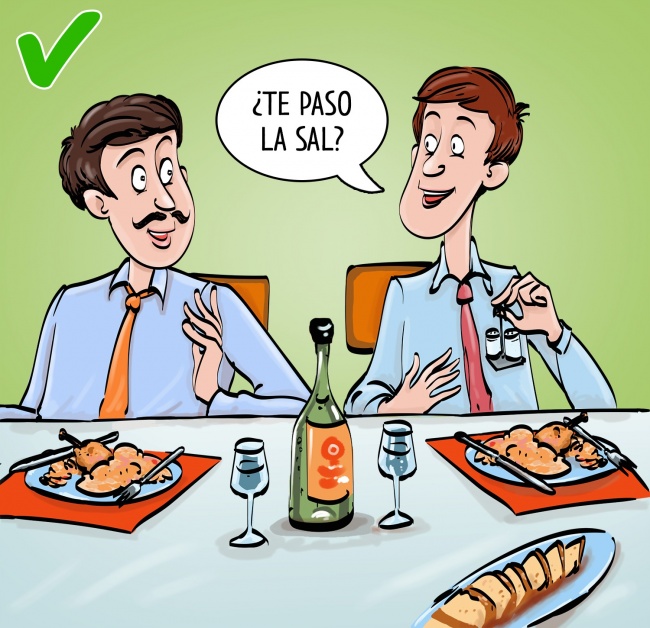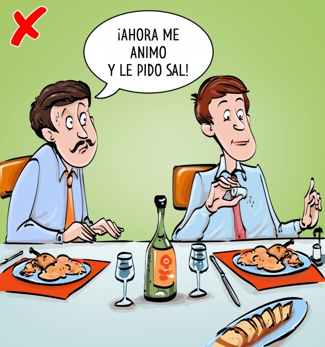 Si usaste la sal debes ofrecerla a tu compañero de mesa. Puede haber gente muy tímida que prefiere comer sin sal antes que pedírsela a alguien. Consejo: el salero siempre se da junto con el pimentero en un soporte. Se dice que es correcto ponerla en la mesa al lado de tu vecino y no pasarla e la mano.
