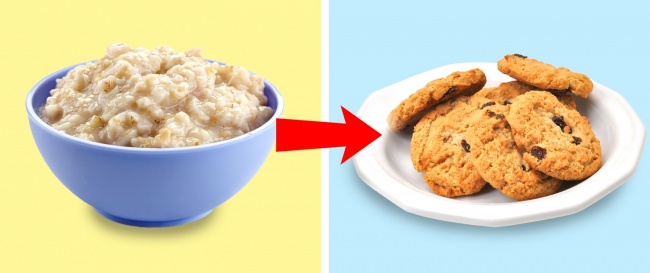 La avena preparada para desayunar, rápidamente deja de ser apetitosa y pierde su atractiva apariencia a primera vista. Entonces , si no has calculado las porciones y has preparado demasiada avena, añade al restante leche, huevo, aceite vegetal, bayas, sal y azúcar a tu gusto. Tendrás la mezcla para hornear magdalenas o deliciosas galletas.