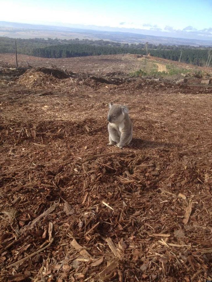 La deforestación por parte de madereros australianos, acabó con el hogar de este koala.