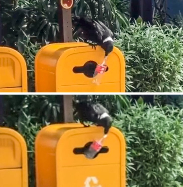 Este cuervo recoge botellas plásticas y las deja en un contenedor.