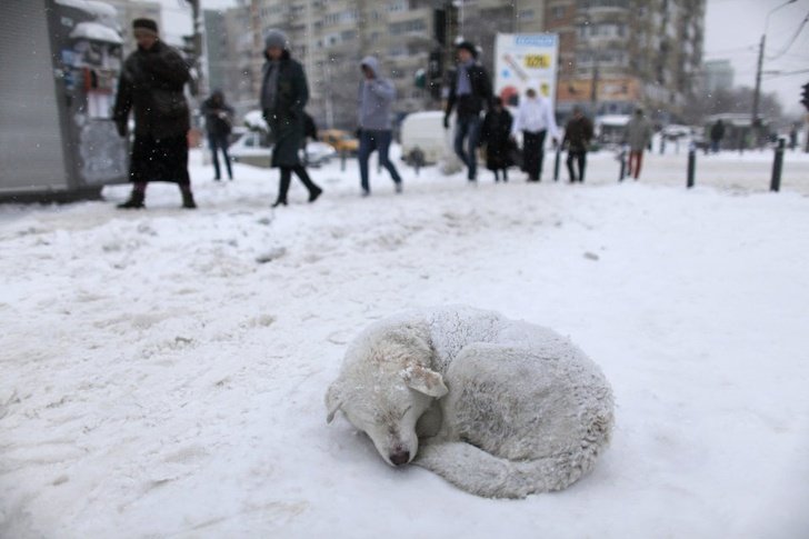 4.Perro acurrucado en Bucarest tras una tormenta de nieve