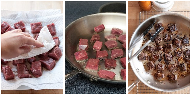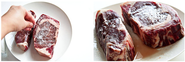 Para que el filete quede crujiente por fuera y tierno por dentro se debe salar el filete, enjuagar, secar bien y cocinar con el fuego al máximo. Al eliminar la mayor parte de agua en la superficie de la carne se formará una deliciosa sopa crujiente en el filete.