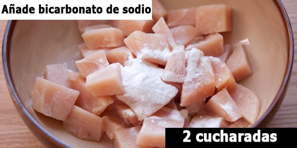 El bicarbonato de sodio aumenta la alcalinidad de la carne, lo que hace que sea más resistente a la rigidez a la hora de cocinarla. Pero debes tener cuidado en las cantidades y el tiempo que se utiliza, ya que dejará un sabor muy fuerte. Lo recomendable es no dejarlo por más de 15 minutos y si aún así conversa el sabor, se puede contrarrestar con jugo de limón.