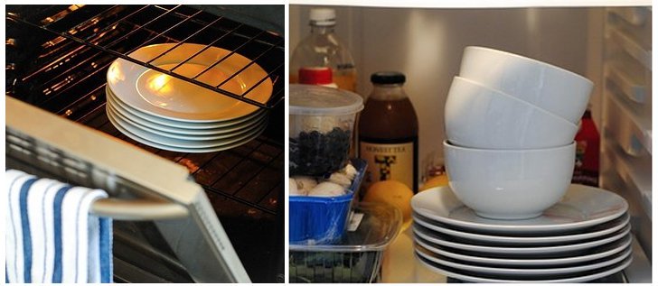 Para que la comida no se enfríe lo mejor es calentar un poco los platos antes de servir la comida, para esto puedes meterlos al horno a 200º por 5 minutos. Para comidas frías es necesario meterlos a la nevera por 20 minutos.