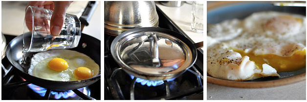 Además de añadir un poco de aceite a la sartén para que no se peguen, cuando los huevos empiecen a blanquear, añade un poco de agua y tápalos. Así te quedarán sabrosos.