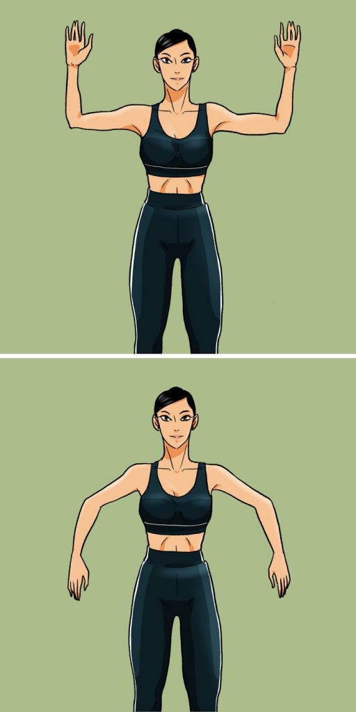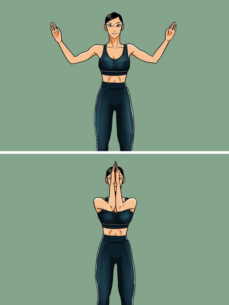 - Junta los antebrazos delante del pecho y luego devuélvelos a la posición inicial