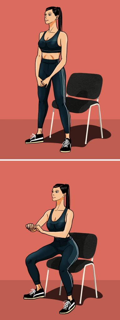 - Llega a tocar la silla con los glúteos y vuelve a la posición inicial
