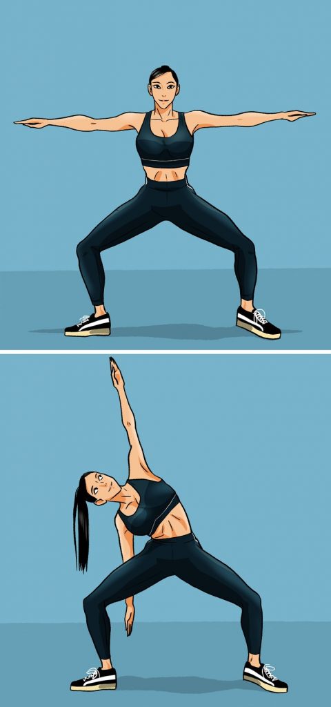 - Vuelve a la posición inicial y dobla el cuerpo hacia el otro lado.