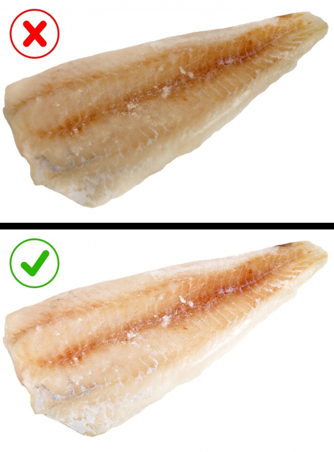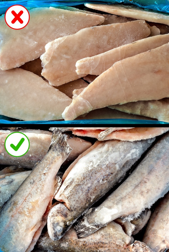 La forma rara del pescado como, por ejemplo, el de la foto, no significa que sea de mala calidad, ya que a veces los congelan en el barco con bloques y pierden su forma. Pero el pescado pegado a otro puede decir que el pescado fue descongelado y luego congelado otra vez. Para verificar la frescura del pescado congelado, coloca en él un cuchillo previamente calentado en el fuego y huélelo. Si sientes un fuerte olor desagradable, demuestra que el producto fue congelado en mal estado.