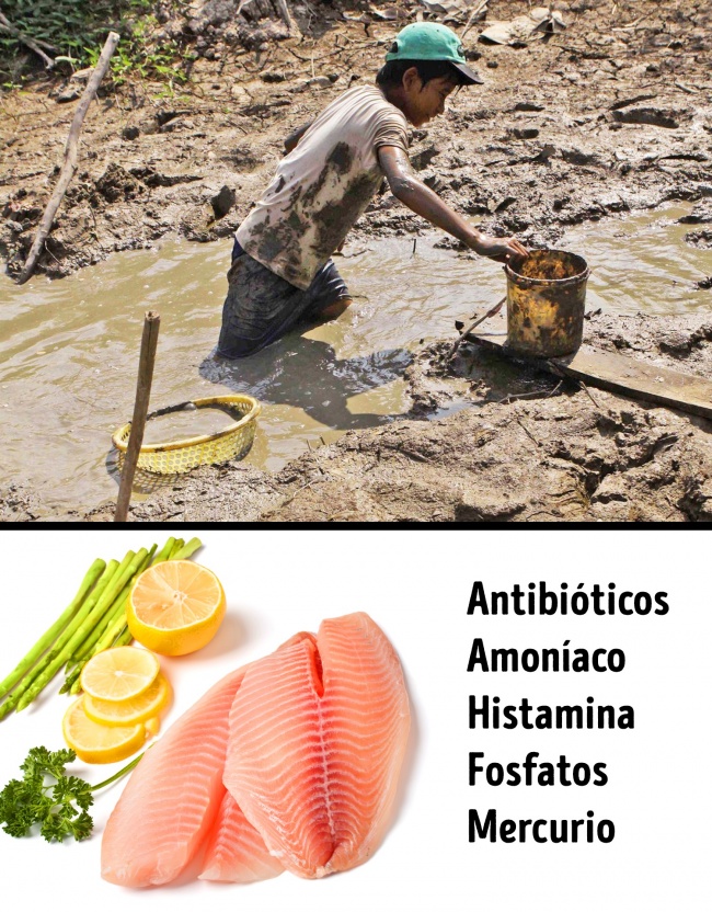 Aparte de fosfatos, el pescado puede contener otras sustancias químicas dañinas, especialmente el pangasius, tilapia y bagre, son ricos en desagradables sorpresas, ya que son cultivados en el río Mekong (de la foto), que entra en la lista de los ríos más sucios del mundo. El análisis del pescado de Vietnam, aparte de polifosfatos, muestra un alto nivel de mercurio, presencia de amoníaco y antibiótico enrofloxacina. Además, en el pescado fueron hallados aminas biógenas, son las sustancias que se forman como consecuencia del almacenamiento incorrecto entre las cuales la más peligrosa para el ser humano es la histamina.