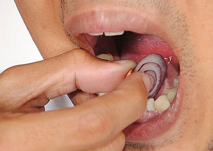 La cebolla tiene fitoquímicos que atacan los gérmenes responsables de la infección y entrega un descanso del dolor. La mejor manera de usarla es cortar un trozo de cebolla y masticarlo en el lado de la boca con dolor. Esto permite que el jugo de la cebolla penetre en el diente. Si el dolor es demasiado fuerte para masticarla, se puede utilizar  un dedo para sostener la pieza de cebolla directamente contra el diente afectado.