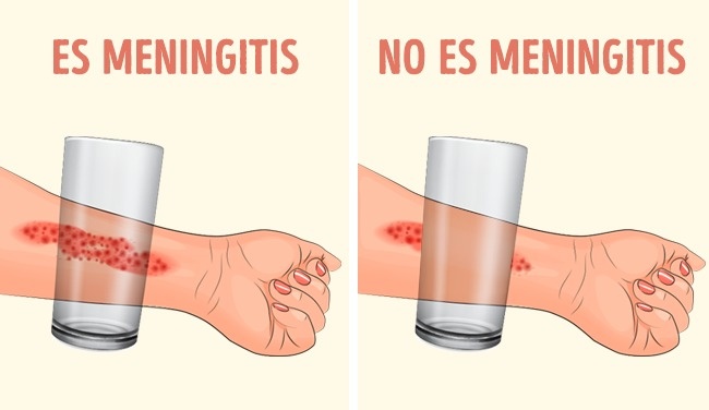 Toma un vaso de vidrio transparente, aplícalo sobre la erupción y presiona de tal manera que la piel debajo del vaso empalidezca. Si la erupción también empalidece, no hay meningitis. Pero si la erupción conserva su color, hay que estar en alerta.