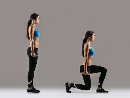 • Da una zancada y haz como si te sentaras, de forma que tu cadera quede paralela al suelo