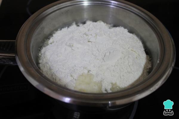 Cuando el agua esté en su punto de ebullición, retírala del fuego y añade la harina. Mezcla todo con una cuchara de madera deshaciendo los grumos para obtener una masa perfecta.