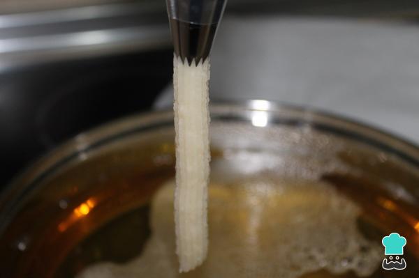 Cuando la masa no tenga grumos, deja que se enfríe un poco. luego pon la masa en una manga pastelera con boquilla estrellada sin que queden burbujas en su interior para que estas no exploten al freír. Si tienes una boquilla fina, también puedes usarla pero sin dejar burbujas en su interior. Así tendremos una churrera casera.