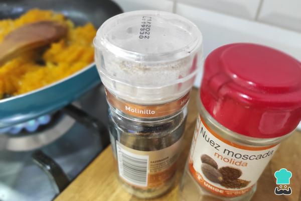 Agrega nuez moscada y pimienta molida y mezcla bien. Baja el fuego al mínimo para preparar la bechamel.