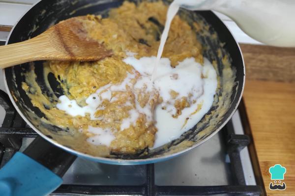 Echa un chorro de leche y remueve y así sucesivamente. Verás que la mezcla se suelta y toma otra textura. Si ves que requiere de más leche, añádela. Remueve sin parar hasta que la mezcla se despegue de los bordes al removerla. Esto indica que está lista.