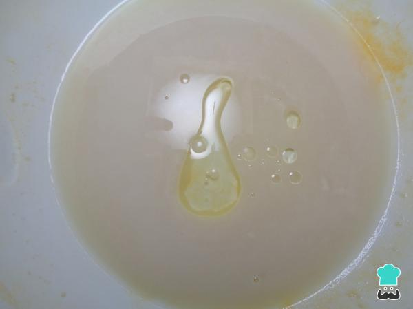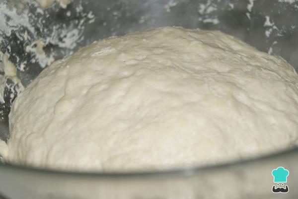 Una vez hayas mezclado la levadura con el agua, añade la sal fina y las dos cucharadas de aceite. Revuelve bien para que se mezclen todos los ingredientes y, antes de que se enfríe, pon la harina de fuerza sobre la mesa en forma de volcán y pon la mezcla en el interior.