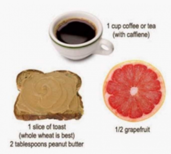 Desayuno: La mitad de un pomelo, 1 tostada (ojalá integral) con una o dos cucharadas de mantequilla de maní (o mantequilla de almendras, de soya, de semillas de girasol, hummus o dip de frijoles) y un café o té sin endulzantes.