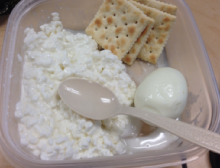 Almuerzo: Una taza de queso cottage o una rebanada de queso cheddar, 1 huevo duro y 5 galletas saladas.