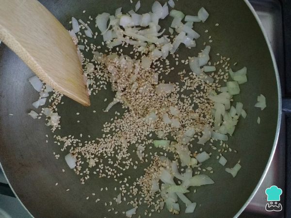Luego agregamos el ajonjolí, lo salteamos todo mientras revolvemos los ingredientes usando una cuchara de madera.