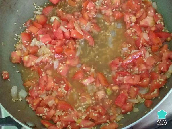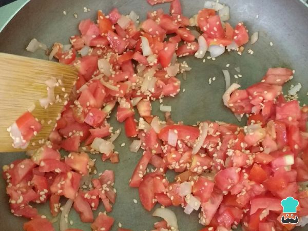 Cuando la mezcla se vea tostada, agregamos el jitomate picado y continuamos cocinando.