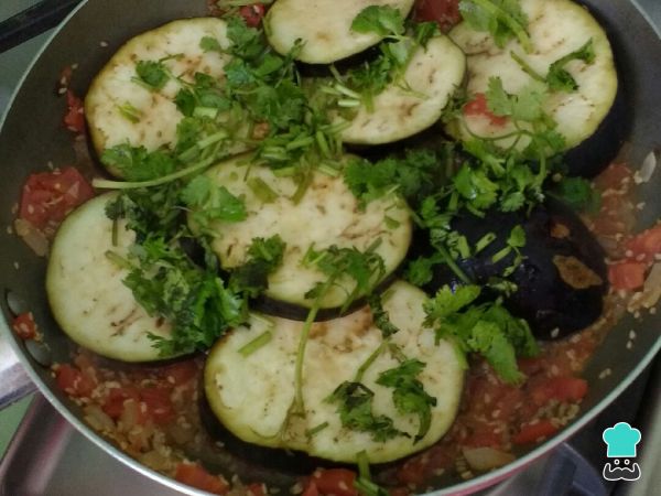 Una vez que el jitomate se esté cocinando y haya soltado una buena cantidad de jugo, agregamos las berenjenas y el cilantro picado.