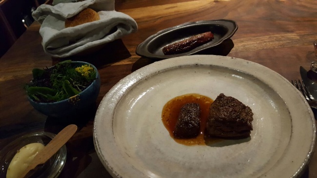 El primero es carne de antílope cocida a término medio, relleno de achicoria italiana y ensalada de hiervas. Como acompañamiento, trajeron panecillo y mantequilla con miel. Según describió la chica, el filete de antílope sabía a un punto medio entre res y ternera.