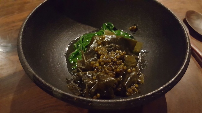 Lo siguiente era un platillo de espinaca bebé, algas y caviar. Las hojas de la espinaca bebé se cosechan en la etapa inicial de su crecimiento, para aprovechar su sabor suave. Las algas estaban fritas con mantequilla purificada preparada con la leche de una vaca llamada Bella, que vive en una granja del mismo restaurante. El caviar es de esturión, salado mediante una especial receta utilizando sal ahumada.