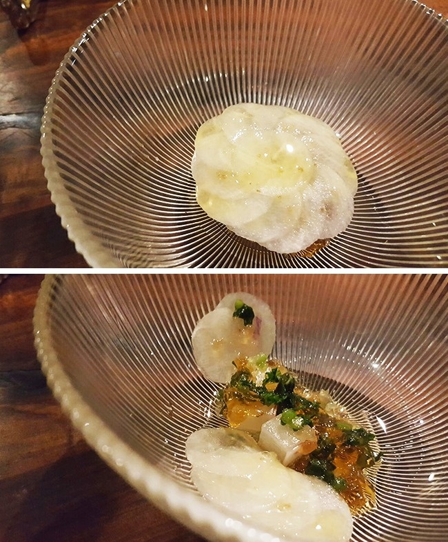 Después le sirvieron un rábano picado en finas rodaja, rociado con mantequilla sobre unos cubitos de rábano marinado, hojas de rábano y gelatina de rábano.