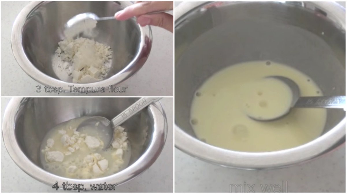 1. Mezcla la harina de tempura con agua hasta congeduir un líquido uniforme.