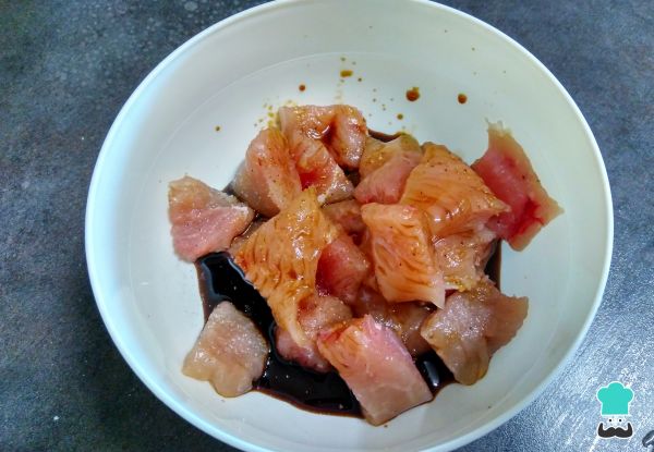 1. Lo primero es marinar el pollo. Corta la pechuga en cubos y colócala en un recipiente junto con la salsa maggi, la miel y una pizca de sal y pimienta.