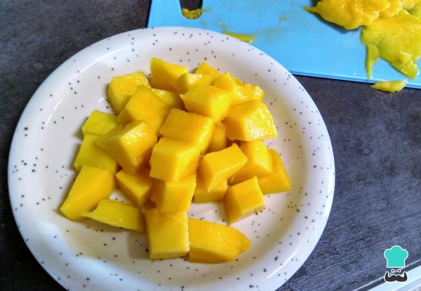 2. Corta el mando en cubos, lo ideal es conseguir trozas más o menos iguales a los de la pechuga de pollo, así será más fácil comer nuestros plato. Lo ideal es que la fruta no esté del todo amdura para poder cortarla sin problemas.