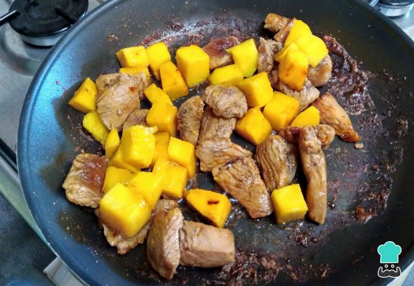 4. Agrega el mango y continúa cocinando hasta que los cubos de mango se empiecen a dorar.