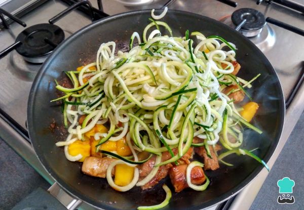 5. Incorpora los tallarines de calabacín a la sartén y mezcla bien. Este plato también pedes hacerlo con los fideos de calabacín en crudo o hirviendo en agua por un par de segundos, sin mezclarlo con el pollo.