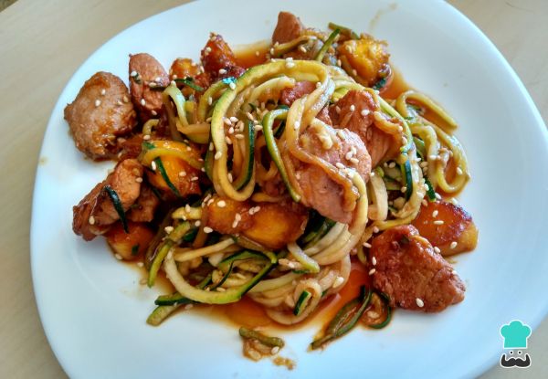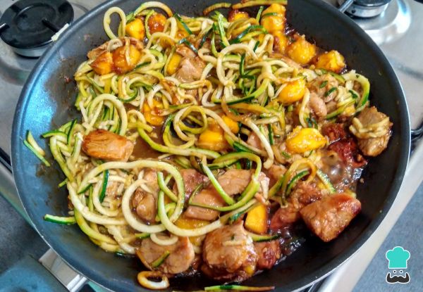 Los tallarines de zapallo italiano con pollo con un plato súper exótico y vistoso que como vez, es muy fácil de hacer y es que la combinación de pollo con mango nunca queda mal.