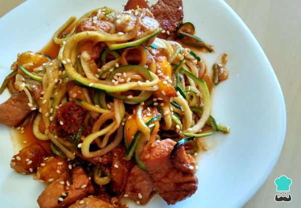 5. Incorpora los tallarines de calabacín a la sartén y mezcla bien. Este plato también pedes hacerlo con los fideos de calabacín en crudo o hirviendo en agua por un par de segundos, sin mezclarlo con el pollo.