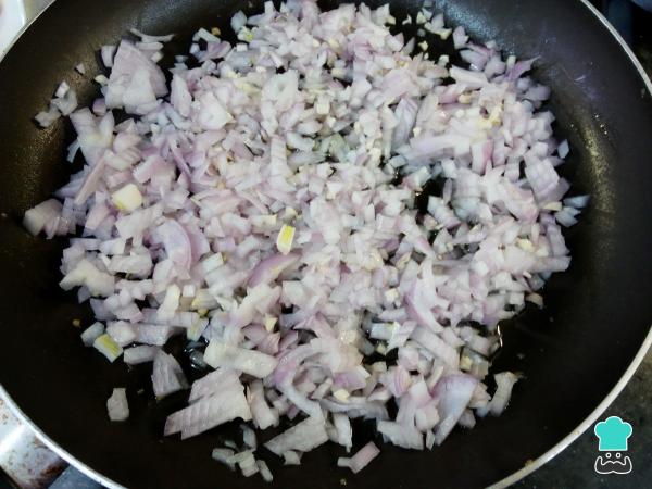 En un sartén (idealmente uno antiadherente) pon las 2 cucharadas de aceite y, cuando esté caliente, añade la cebolla y los ajos picados. Póchalos hasta se encuentren bien dorados.
