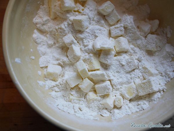 1. En un bol mezcla la harina, la manteca y el azúcar hasta que esté compacto y suave, que no se pegue en las manos.