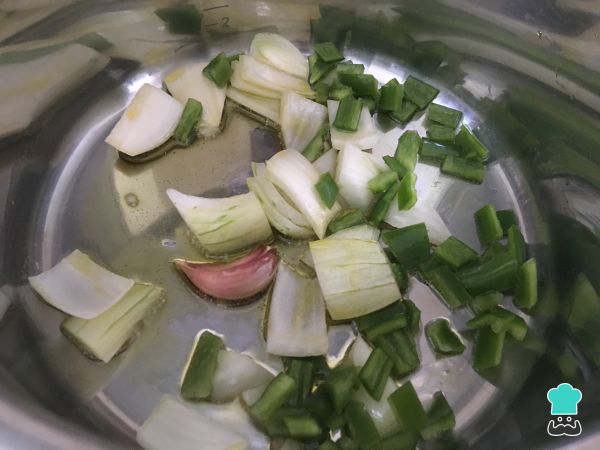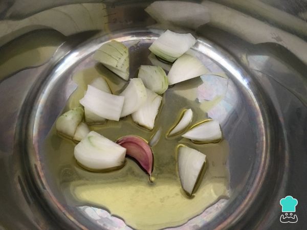 En una olla, sofreír el ajo entero con la cebolla cortada en trozos medianos. Dejar que se cocinen durante 4 minutos.